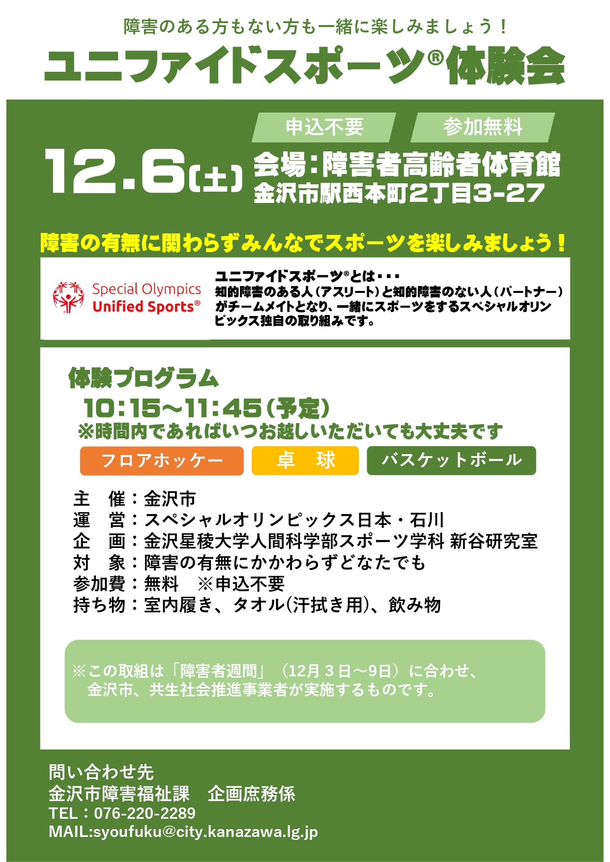 障害者週間(12月3日〜9日)に合わせ、障害の有無に関わらずみんなでスポーツを行う「ユニファイドスポーツ」の体験会を実施しますので、ぜひご参加ください!