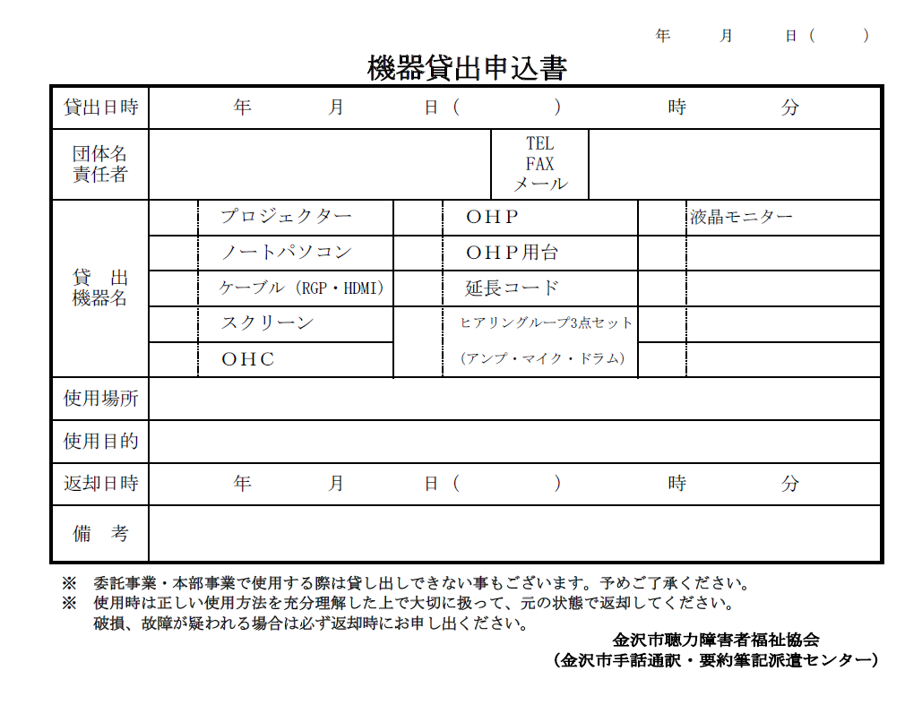 金沢市聴力障害者福祉協会で所有・保管している機器を貸し出しています。申請用紙を印刷して必要事項を記入の上FAXするか、