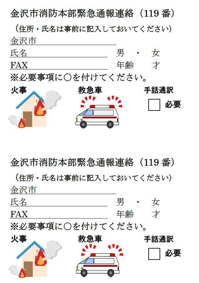 金沢市消防局ではFAXによる救急車や消防車の要請ができます。