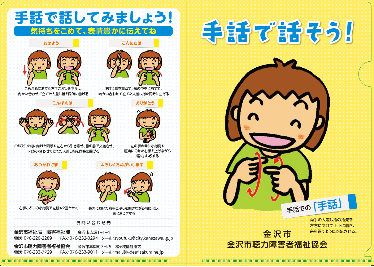 小学校講座や、手話体験コーナーにおいてリーフレット(A5二つ折り)・クリアファイル(A4)を配布しています。