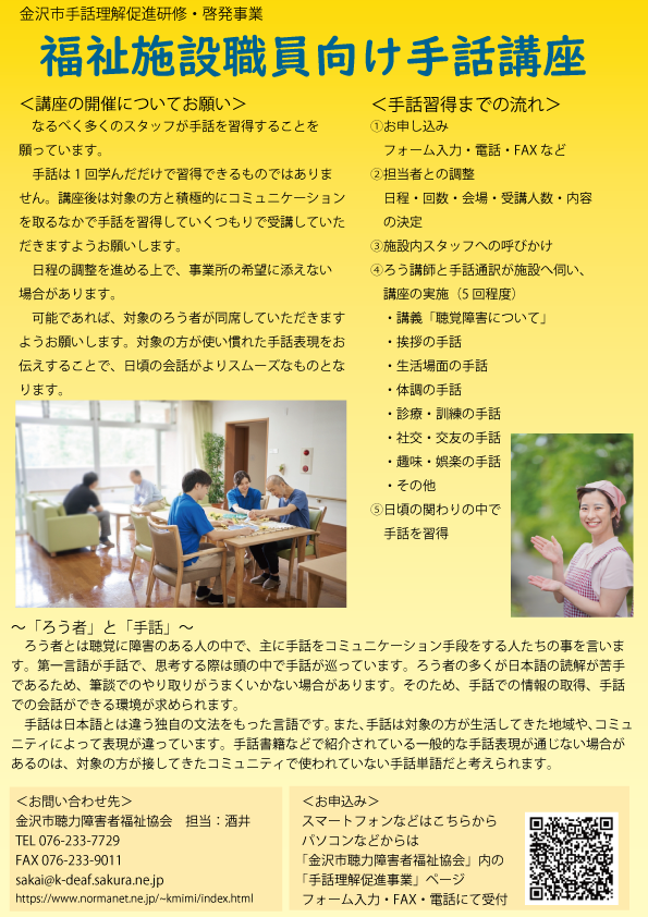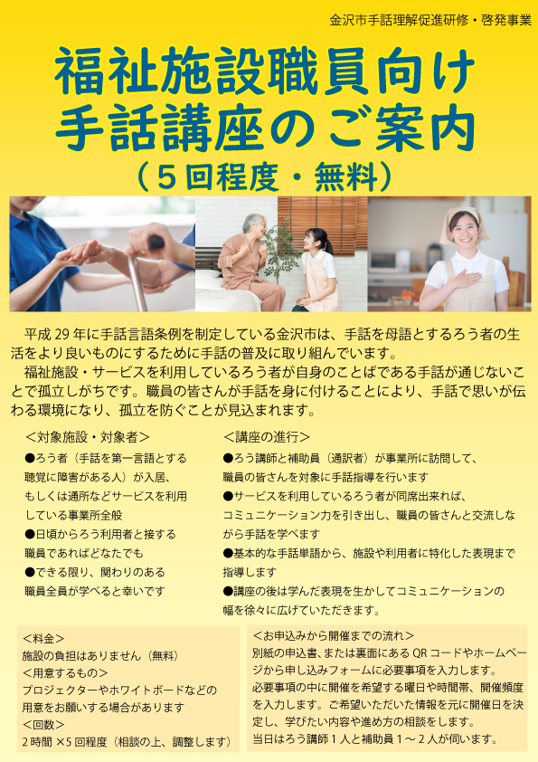 金沢市内の福祉施設職員を対象に手話講座を行っています。